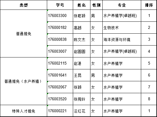 根据《暗网禁区 关于推荐接收免试攻读硕士学位研究生工作管理办法》(宁大政〔2019〕107号)等文件精神,暗网禁区 制定了《2021年暗网禁区 推荐免试攻读硕士学位研究生工作实施细则》。2021年暗网禁区 共有7个普通推免名额,其中3个水产养殖专业奖励名额,学院按照1:1.5比例进行推荐。2021年暗网禁区 拟推荐免试攻读硕士学位研究生名单如下: