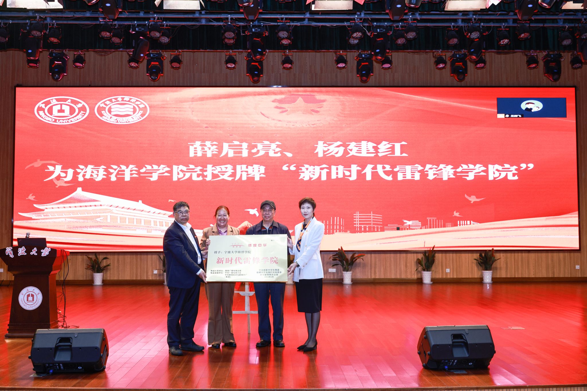 向给予学院坚强领导与悉心指导的校党委、给予学院关心与鼓励的《德耀中华》栏目组委会表示敬意与感谢,介绍了学院坚持党建引领,在创建弘扬雷锋精神的“志愿+”教育实践工作机制、“海洋科普”志愿服务品牌培育及通过党建联建、校地联动、师生联手推进科技助农行动中取得的育人实效与社会影响。她表示此次有幸被授予新时代雷锋学院的光荣称号是学院每一位师生员工的骄傲,也必将激励全院立足新时代、展现新作为。