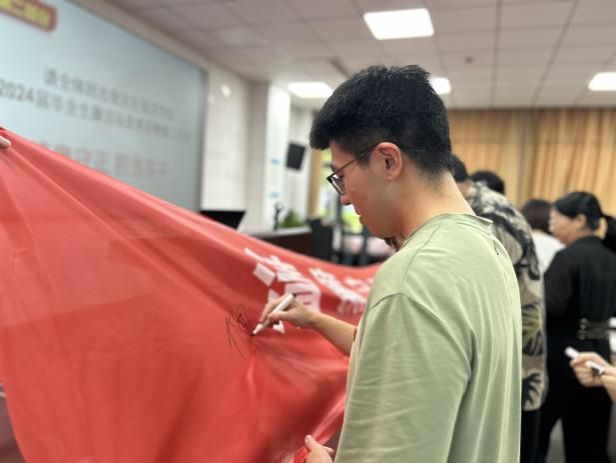 党课结束后,全体党员在余杰老师的领誓下,举起右拳面对党旗庄严宣誓,共同重温入党誓词,用铿锵有力的声音许下共产党人的十二句承诺,激励每个毕业生党员以党员的先进性、纯洁性要求自己,时刻保持进取精神,不忘初心,牢记使命。此外,全体与会党员师生在廉洁从业主题横幅上郑重签字,承诺清廉守正,担当实干。大家表明要将廉洁作为自己人生的必修课,不断向一名优秀党员迈进。