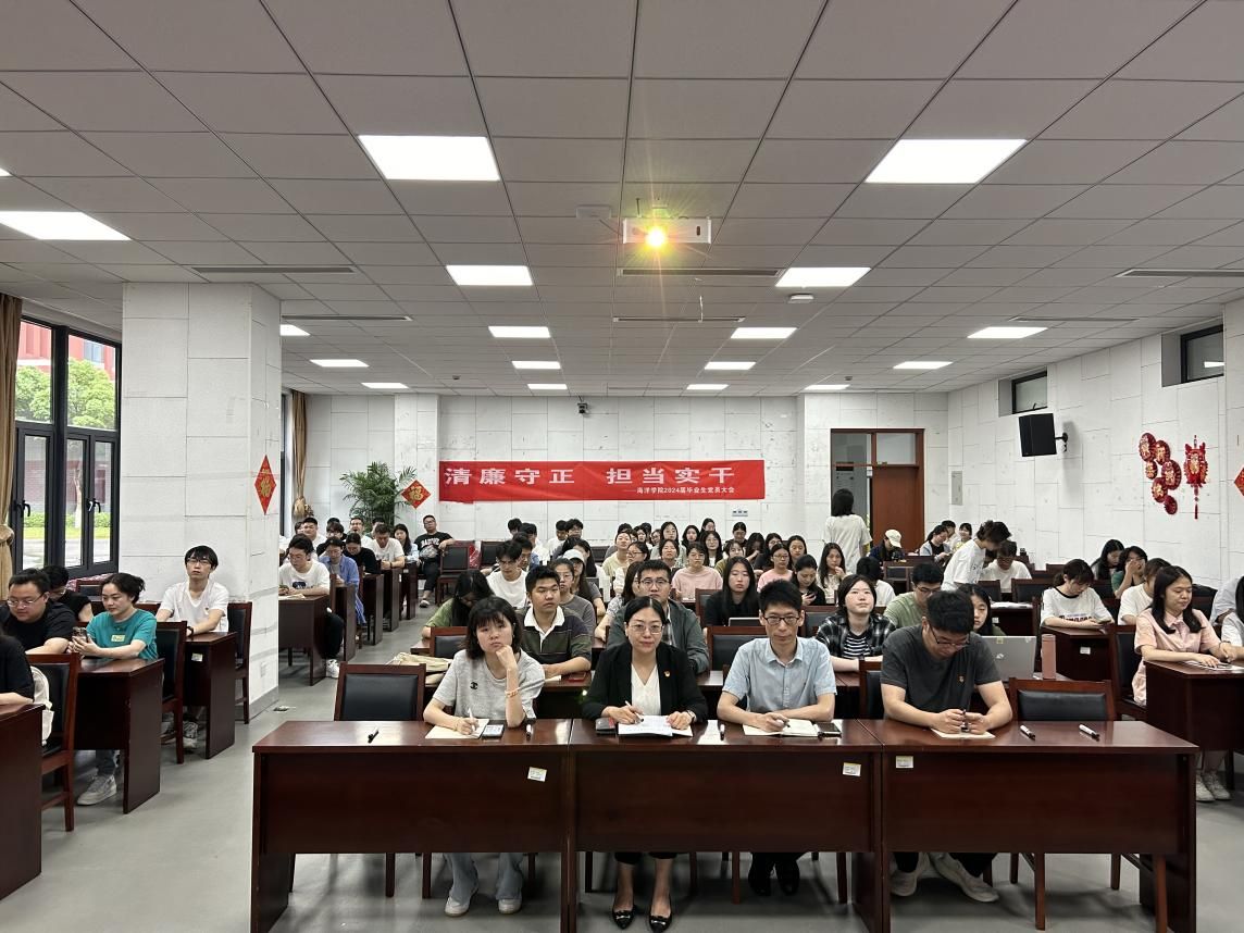 在海洋东楼107会议室召开毕业生党员大会暨廉洁教育活动,为即将踏上新征程的毕业生党员开展最后一堂思政课。学院党委副书记、纪委书记张乐,分团委书记崔浩亮,辅导员吴丹丹、余杰、曹家旗,各学生党支部书记以及2024届全体毕业生党员参加了本次大会,会议由余杰老师主持。