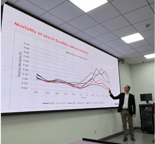 副院长徐嘉杰教授主持,学院50多名师生参加了本次论坛。Herve Migaud教授结合自身在三文鱼繁育及选育方面的研究历程,以及美威公司在全球三文鱼产业的布局,技术开发对三文鱼养殖现状,遗传选育方法,苗种繁育及养殖管理过程,人工智能应用等方面进行了详细介绍。