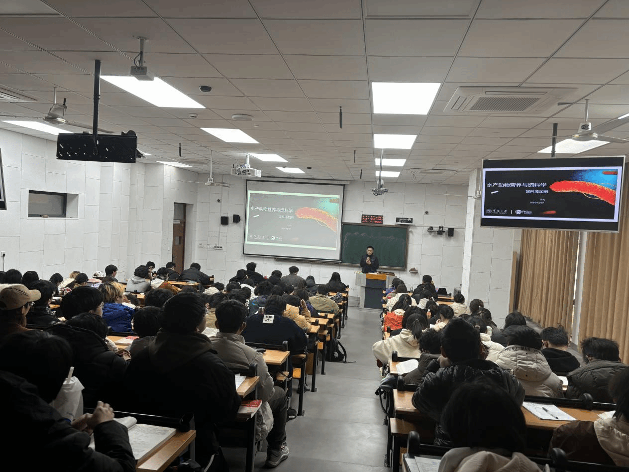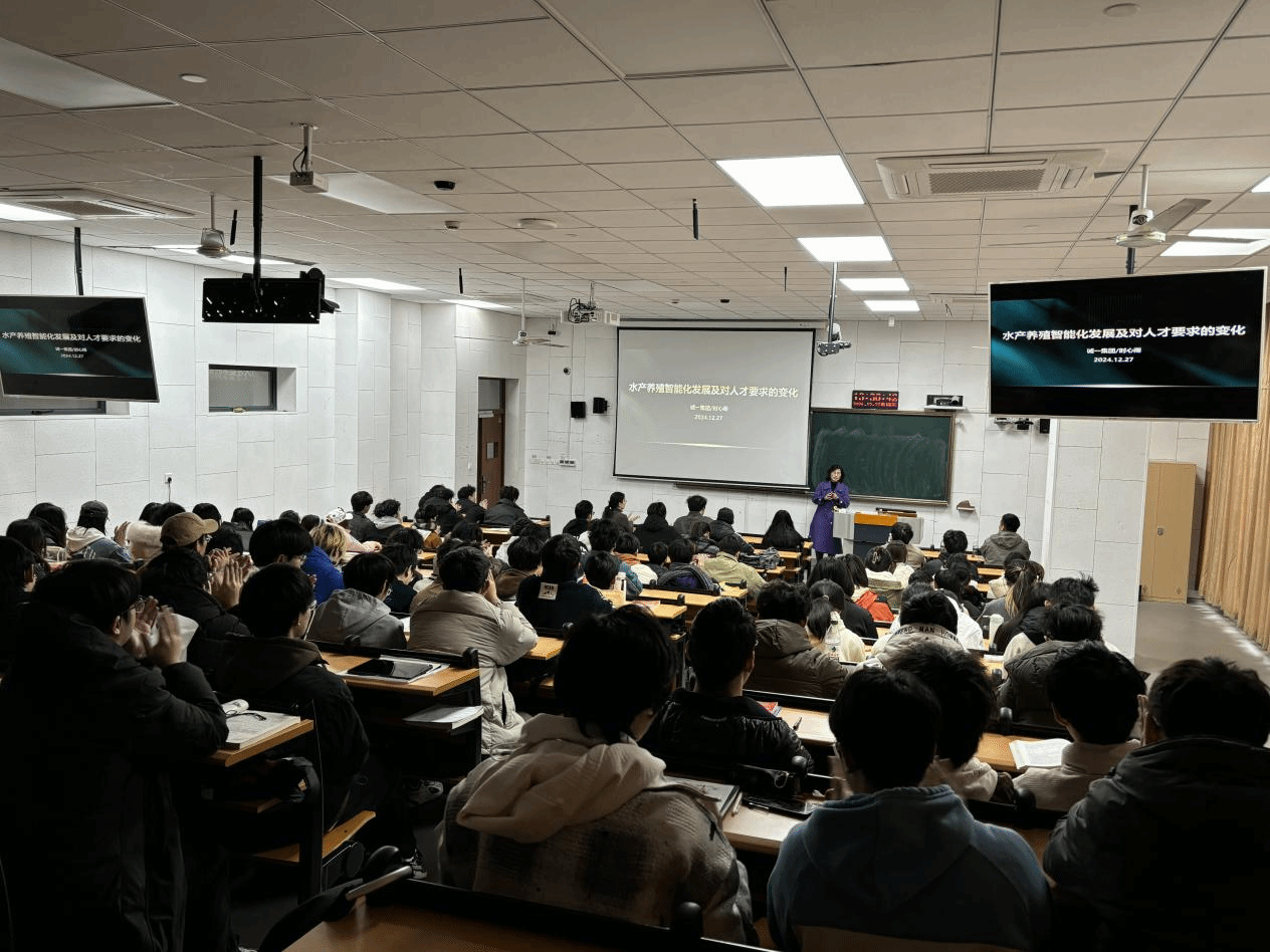 副院长陈相瑞教授的主持下,为2023水产(拔尖人才创新班)、2023水产养殖1班和2班,共100余名学生授课。该课程为省级线下一流课程和校级校企共建课程。本次课程包括两部分内容:首先,由时心雨总经理讲授《水产养殖智能化发展及对人才要求的变化》。她从中国水产养殖的现状与挑战、规模化养殖的实践经验、诚一公司的智能化养殖解决方案、以及智能化发展对人才需求的变化等方面进行了详细讲解。她强调了智能化技术在水产养殖中的重要性,尤其是在提升生产效率和解决环境问题方面的潜力。随后,李弋经理分享了关于饲料添加剂的相关知识,重点讲解了饲料添加剂的定义、使用方法及其重要性。通过具体实例,李经理深入分析了饲料添加剂在水产养殖中的作用及其对动物健康和养殖效益的影响。两位专家结合自身经验和实际案例,为学生们详细讲解了水产动物营养与饲料学的核心内容,将理论与实践有效结合。这不仅激发了学生们的学习兴趣,也增强了他们对专业的认同感,为培养适应市场需求的专业技术人才奠定了良好的基础。