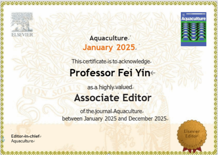 尹飞教授受Elsevier旗下《Aquaculture》期刊邀请,担任该刊副主编。主要负责处理水产养殖技术、水产病害防控、渔业智能化等方面的稿件,评估稿件质量和创新性,邀请评审专家审稿,决定稿件录用与否,以促进期刊发表高水平的科研论文。