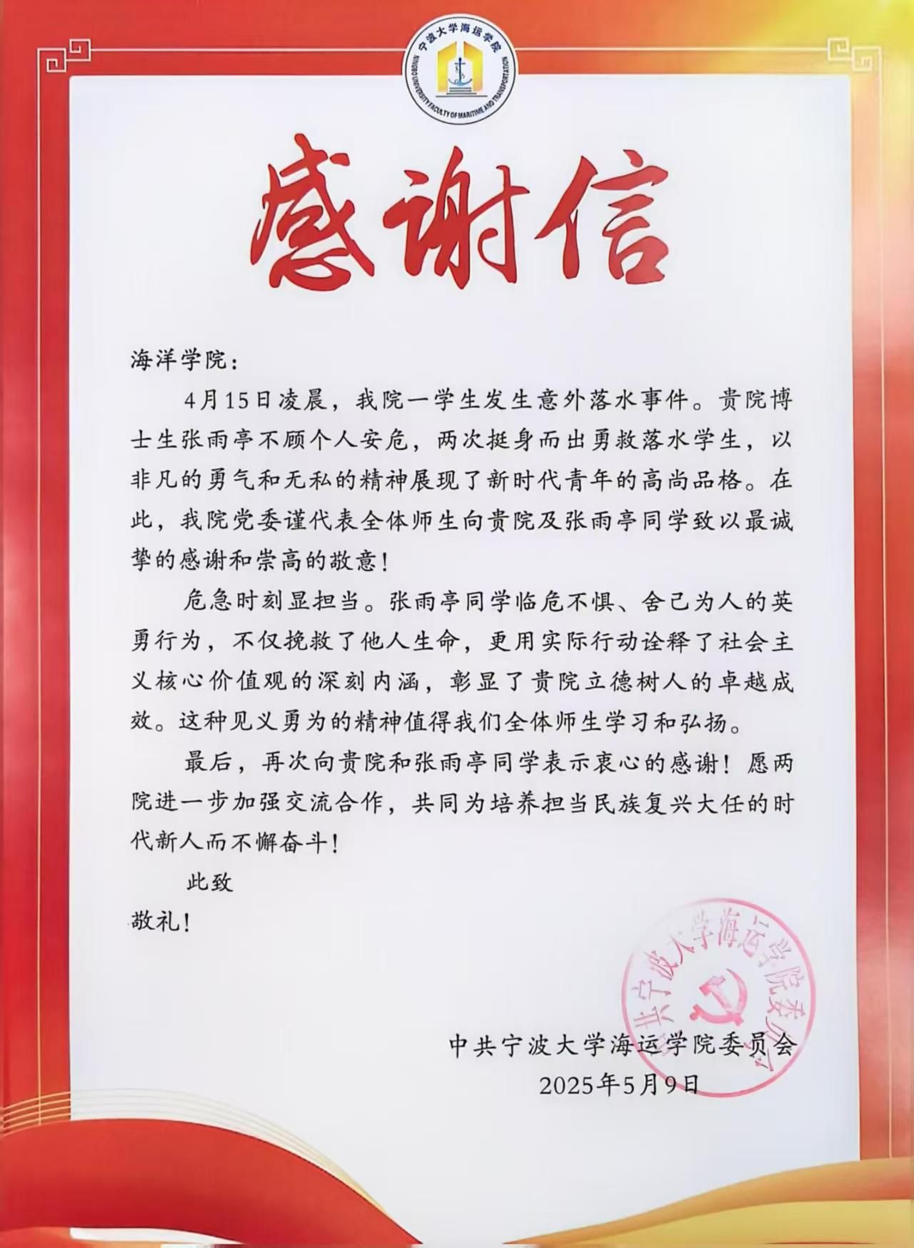 学院为张雨亭博士颁发了感谢信和纪念品,以表彰他的见义勇为行为。在座谈会上,张雨亭博士介绍了自己的救人经历和感受。他表示:“作为一名中共党员,本人虽不会游泳,但当时看到有人溺水,我只想着尽快把人救上来,经过三次下水后最终用游泳圈、救生筏等工具把落水同学成功救到岸边。今后,如果再遇到类似的情况,我依然会在确保自身安全的前提下勇敢站出来施以援手。”