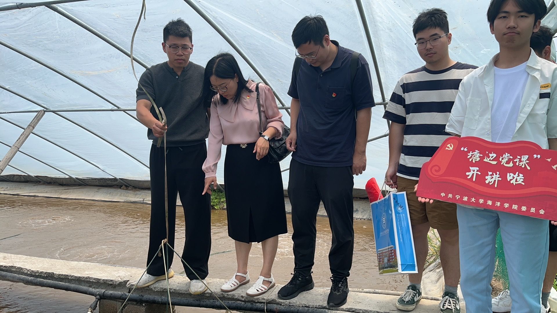 在舒开河校友的带领下,学院师生参观了养殖园区,开展了一堂生动的塘边党课。舒开河校友带领当地农民致富,曾获评2024年浙江省乡村振兴带头人、宁波市青年助力乡村振兴“青牛奖”和宁波市大学生创业新秀,他表示随着公司业务的不断拓展,对专业人才的需求日益增加,特别是在水产养殖、食品加工、市场营销等领域,欢迎学弟学妹们加入公司,在乡村振兴的大舞台上建功立业,争做共富青年先锋。