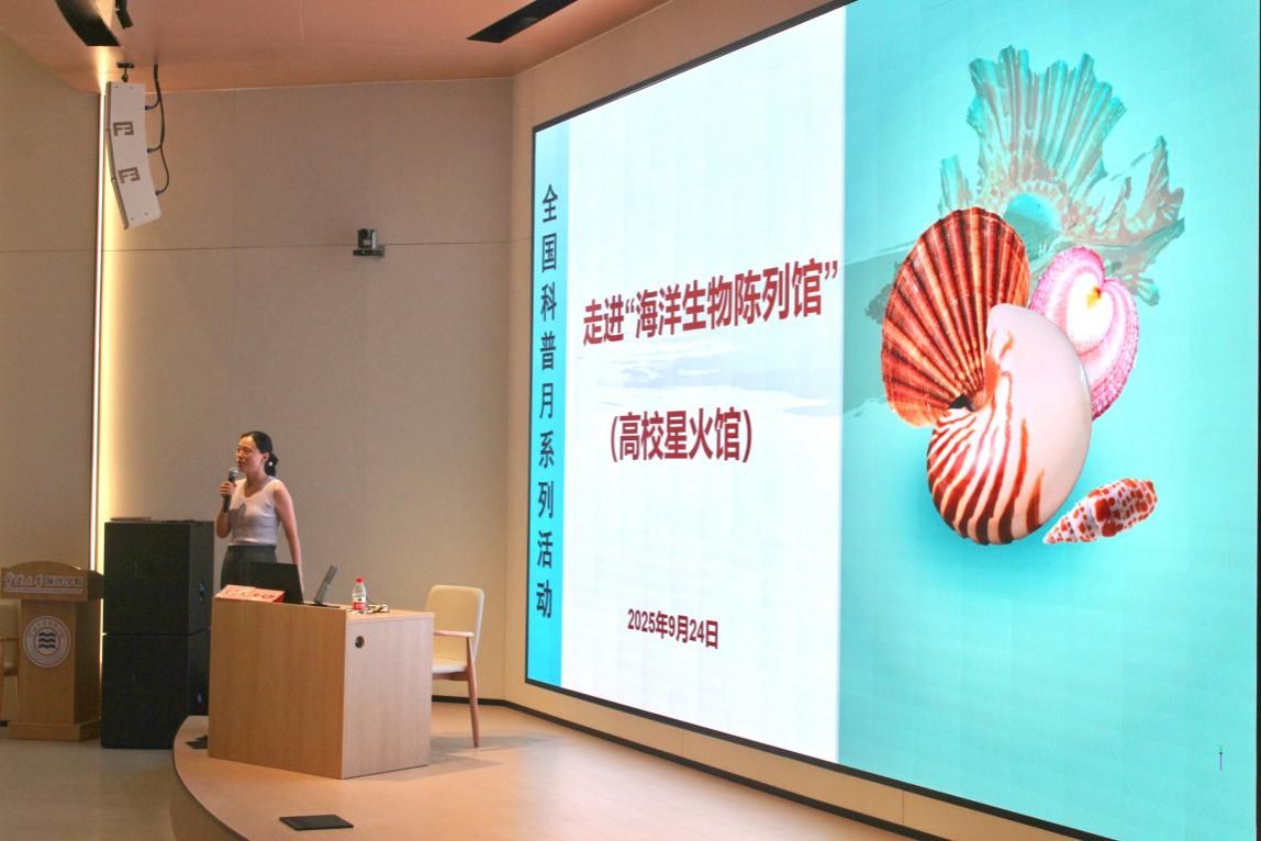 活动首站设于学院学术报告厅。海洋科普段雪梅老师以“海洋生物陈列馆”的馆藏为基础,结合贝类生物学知识,展开“神奇的贝类世界”科普课堂。科普以生动的图片和视频展示了贝类的分类、世界名贝、奇形怪状的贝类、有毒的贝类等基本知识。