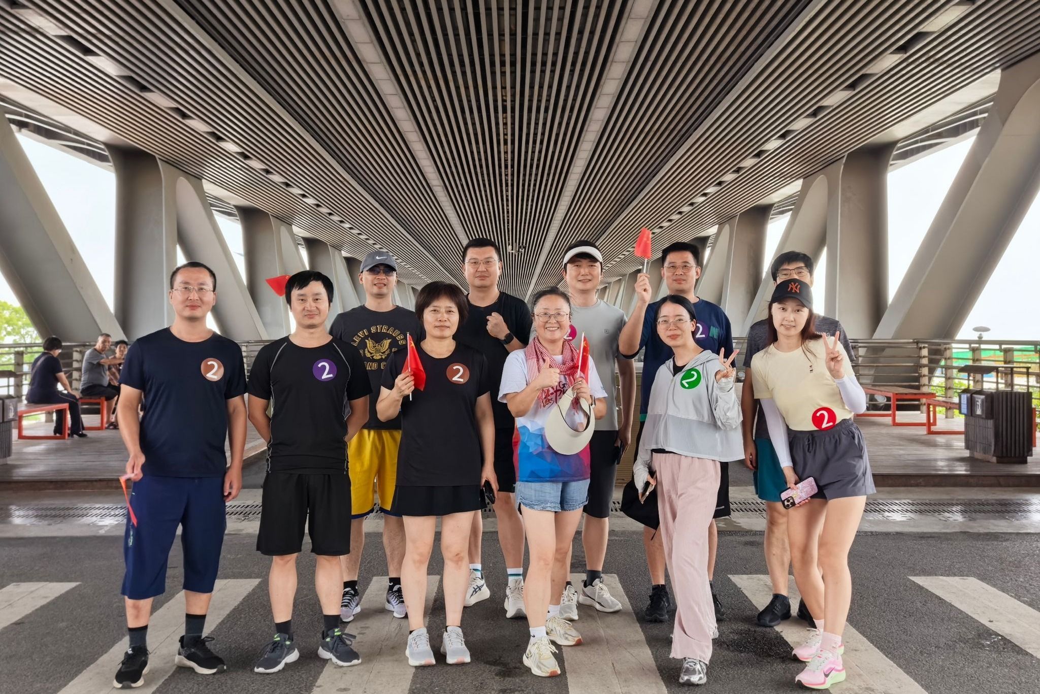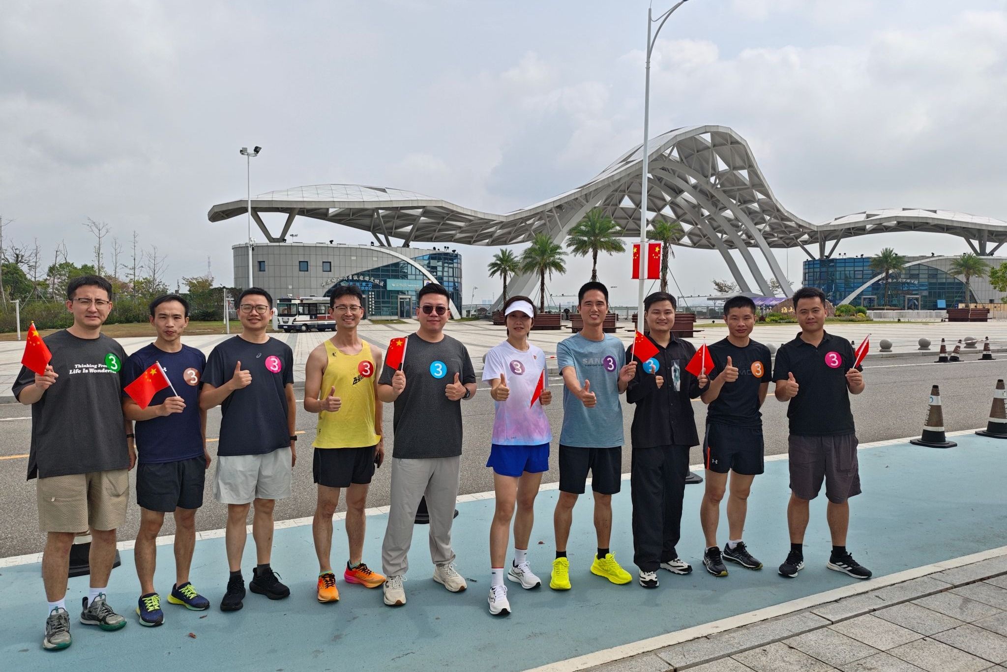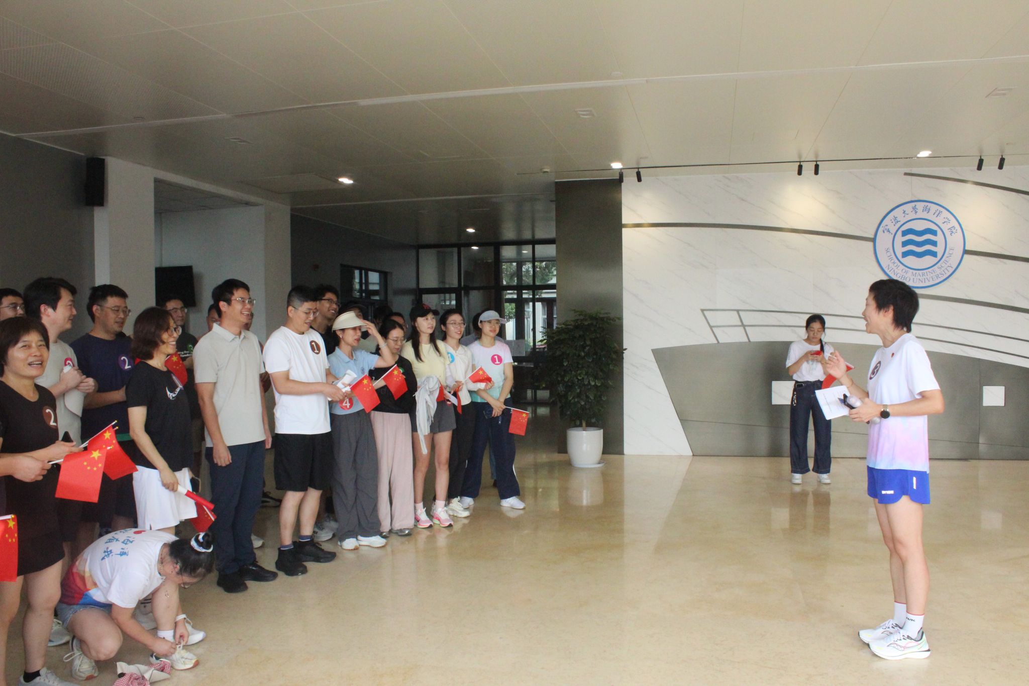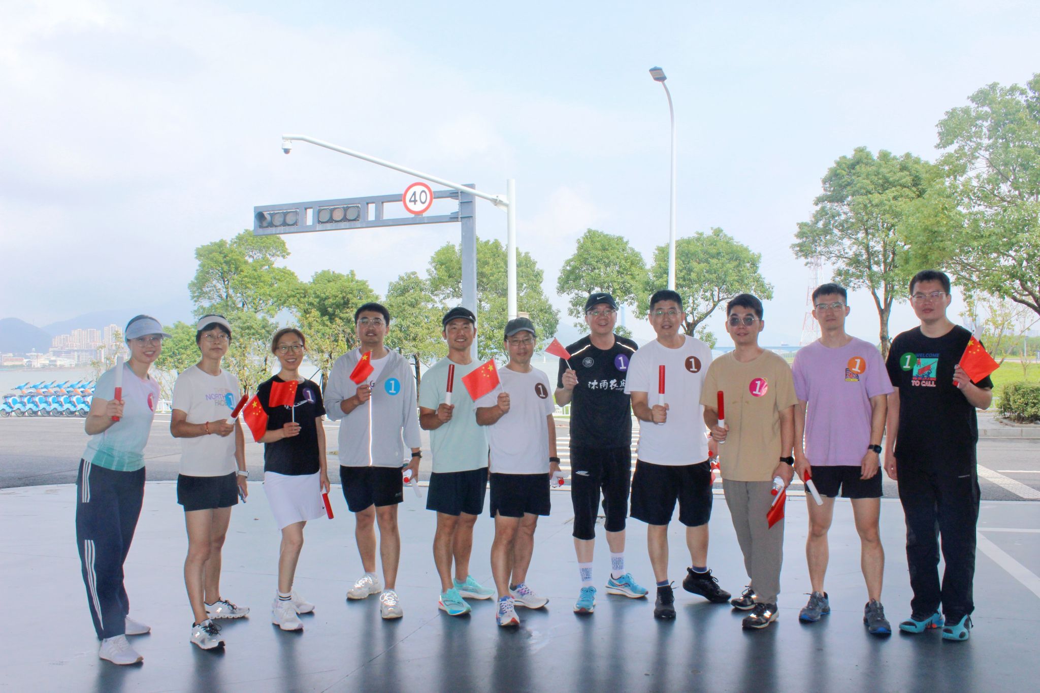 上午10时,参与活动的教职工齐聚海洋南楼一楼大厅,现场气氛热烈。活动伊始,工作人员统一分发号码牌,随后学院党委书记邵丽发表动员讲话。她指出高校教师作为立德树人的第一线,既要用知识为学生“赋能”,又要用健康的身心为教育事业“续航”;她强调就如跑道上的坚持与接力,教育工作者在讲台、实验室的坚守,都是为国家培养人才、为民族积蓄力量;她鼓励大家在奔跑中感受运动的快乐,在并肩前行中凝聚团队的力量,以更加强健的身心、更加昂扬的姿态,扎根教育沃土,为培养担当民族复兴大任的时代新人贡献力量,以实际行动向祖国献礼!全体人员在合影留念后,认真听取了活动注意事项,随后统一乘车前往梅山湾比赛地点。
