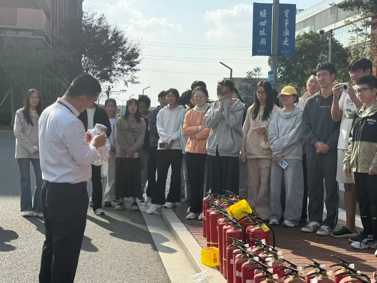活动现场设置了消防知识宣讲、灭火器实操、防毒面具使用教学等环节:北仑消防大队讲解员详细演示了灭火器“提、拔、握、压”的使用步骤,指导新生分组实操灭火;同学们掌握消防器材操作技能。同时,工作人员通过案例讲解、逃生技巧演示,普及了火场疏散、有毒气体防护等实用知识。