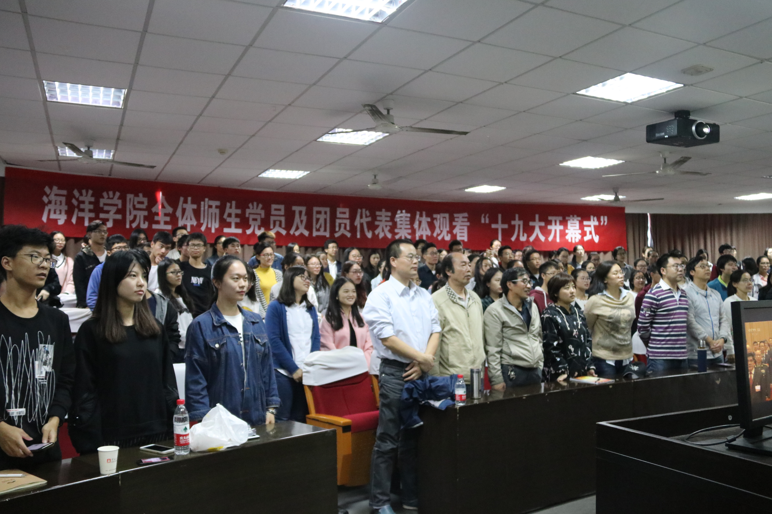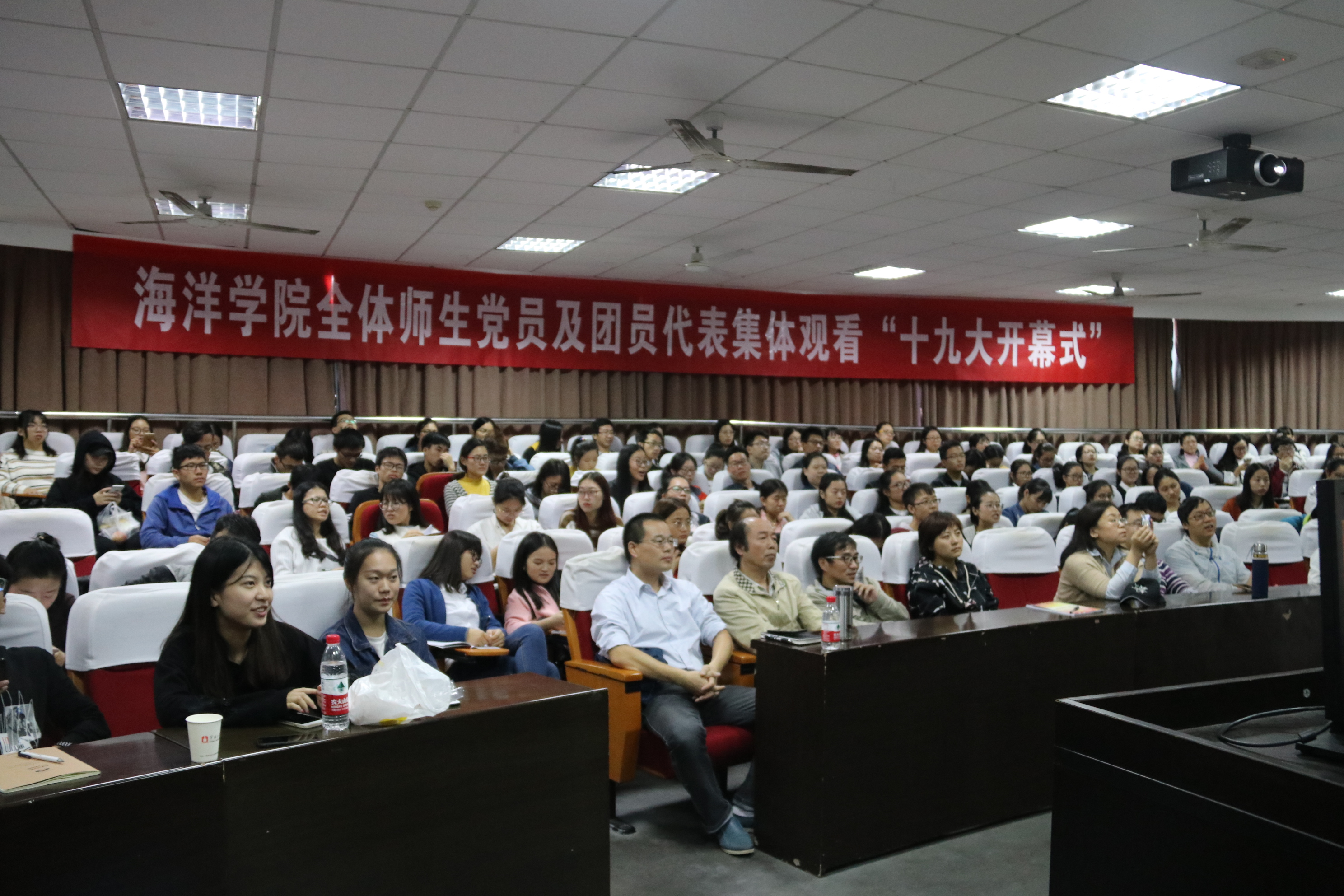 师生党员和团员代表200余人集中收看开幕会,第一时间学习十九大会议精神。
