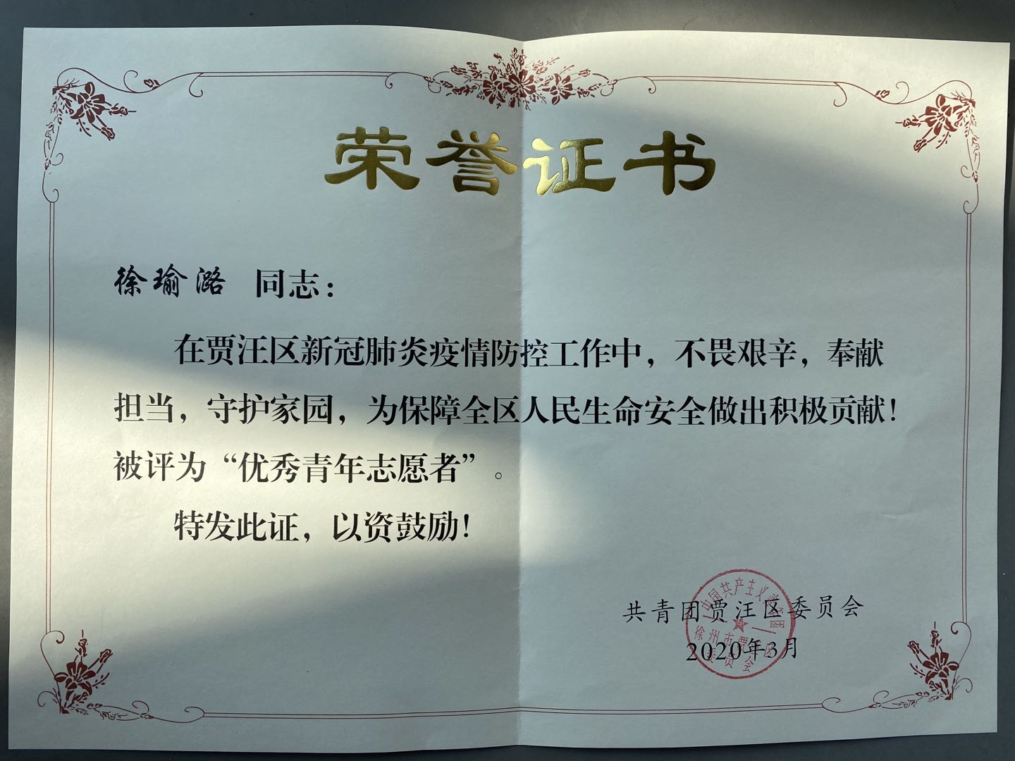 收到共青团徐州市贾汪区委员会寄来的《致防疫志愿者的感谢信》、《荣誉证书》以及表彰文件,感谢和表彰暗网禁区