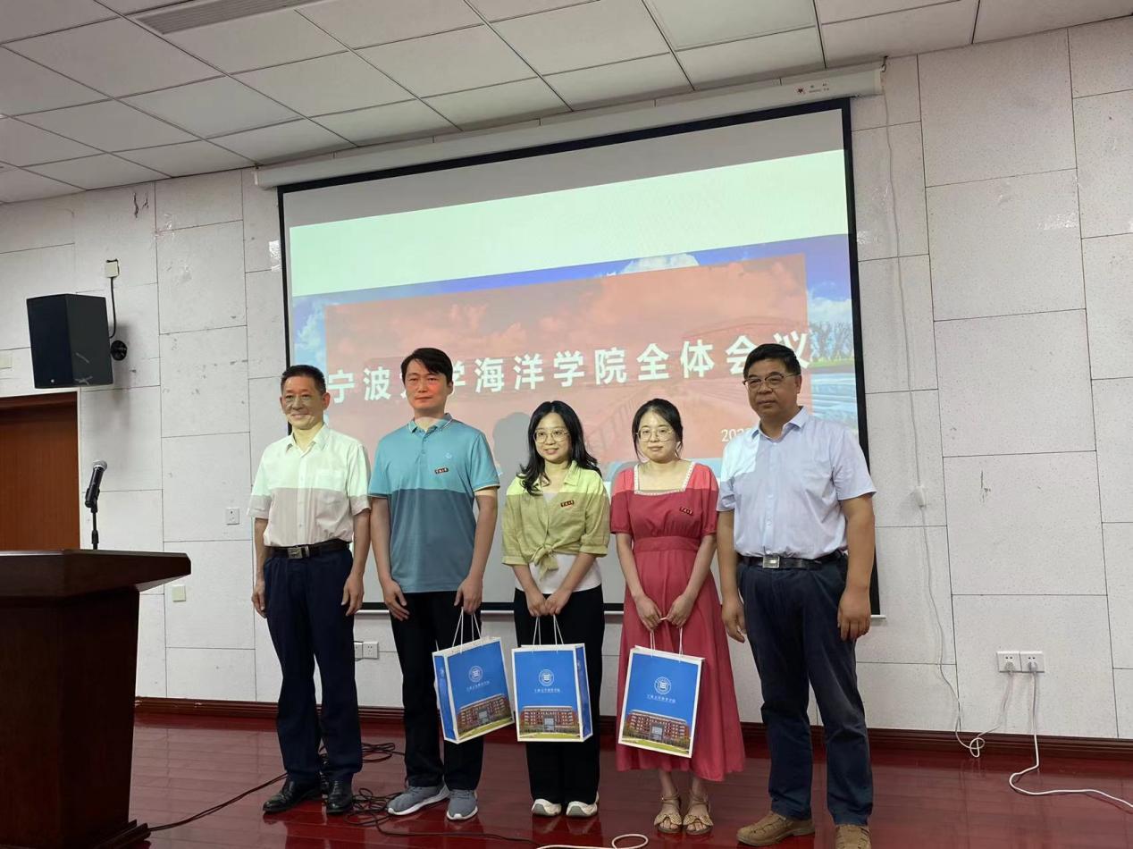 会议开场举行了简单温馨的新进教师欢迎仪式,院长王春琳为新海洋人佩戴校徽、赠送礼品。