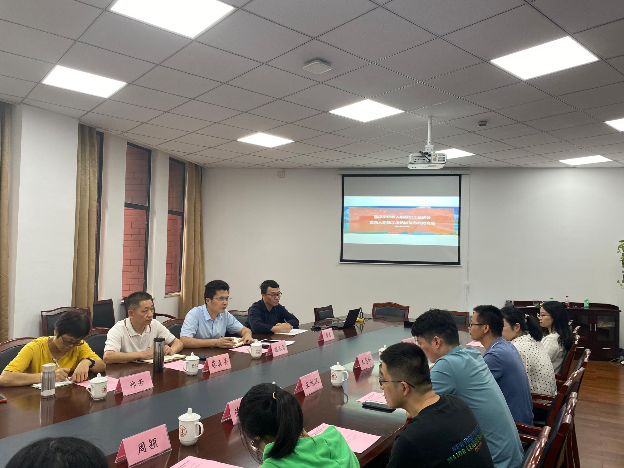 召开2022年新入职教工廉洁诚信专题教育会,学院党委书记蔡真亮、副书记兼纪委书记谢冰蕾、党政办主任、组织员和7位新进教职工参加了会议。