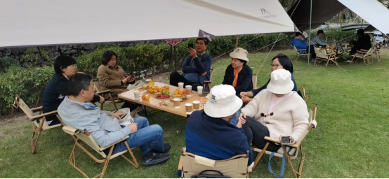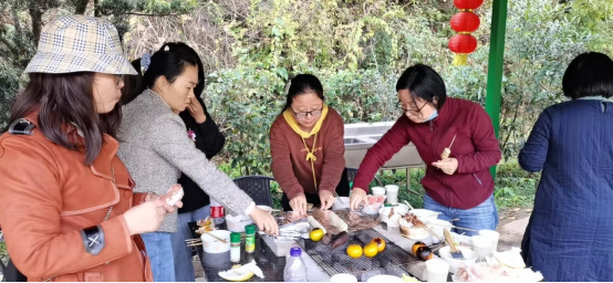 午餐时分,大家在景点外围支起炉灶自助烧烤,在缭绕的烟幕中客串、交流、酣吃畅聊。随后,走栈道,爬山坡,一路欢歌笑语,尽享徐凫岩远近高低不同视角的美景。下午茶歇时光,在一张张天幕下,大家品茗畅叙,在和睦欢畅的氛围中感受工作之余同事间的温情。