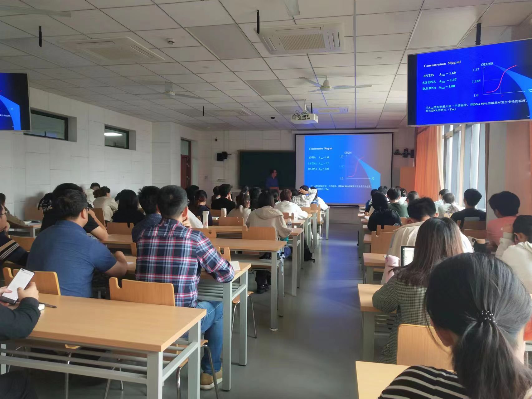 授课过程中,姜海波老师主要讲解了DNA变性和复性的条件与应用、基因及基因组结构与功能的关系。在专业知识讲授中,姜老师针对分子生物学发展历史中重要的诺贝尔奖的发现,强调坚忍不拔、求真务实、不断革新的科学精神;同时讲述了PCR技术的发现对现代分子生物学的重要意义,强调理论与实践相结合并勇于创新的精神;最后结合人类基因组测序历史过程,强调在上世纪八九十年代经费紧张的情况下,我国科学家积极参与人类基因组(HGP)计划,并在人类基因组测序过程中做出了重大贡献,提升民族自信心。