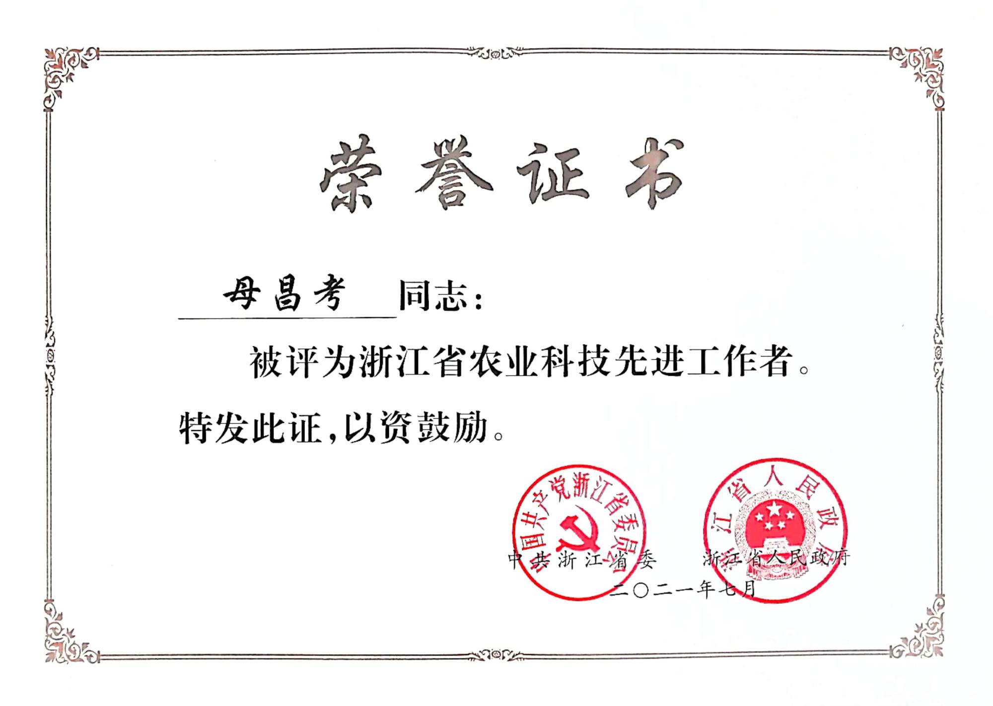 母昌考获浙江省委颁发的浙江省农业先进科技工作者荣誉称号(2021年)