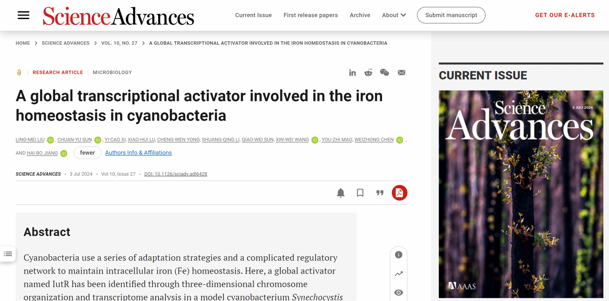 姜海波教授团队在Science子刊《Science Advances》上发表了题为“A global transcriptional activator involved in the iron homeostasis in cyanobacteria”的研究论文(图1),揭示了一个全局性转录激活因子参与调控蓝藻铁稳态的新机制。