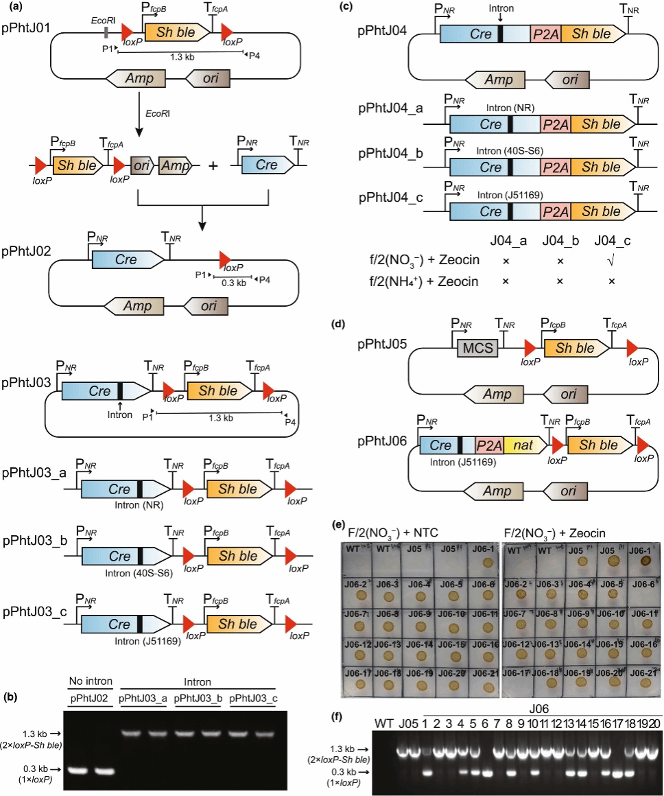 三角褐指藻富含多不饱和脂肪酸、色素和抗氧化剂等天然成分,在制药、化妆品及食品工业中具有广泛应用潜力。然而对于三角褐指藻的开发仍存在缺乏精准的同源重组整合工具、有限的筛选标记种类以及缺乏高效的遗传标记回收系统等问题。为解决三角褐指藻遗传改造中存在的筛选标记匮乏的问题,本研究首先在三角褐指藻中建立源自噬菌体P1的 Cre/loxP 重组系统。Cre重组酶可识别特异的loxP序列,并有效切除两个loxP位点之间的选择标记。研究中在首先通过在Cre序列中插入来源于三角褐指藻内源基因nr(Phatr3_J54983)、40S-S4(Phatr3_J18559)和Phatr3_J51169的内含子序列,避免了在原核表达中的自切除现象。进一步研究表明,cre序列插入Phatr3_J51169的内含子在藻细胞中表达转录后,可被高效剪切并翻译成完整的Cre蛋白序列。该 Cre 重组酶可有效去除在藻基因组上整合的两个同向 loxP 序列之间的筛选标记基因(图2)。