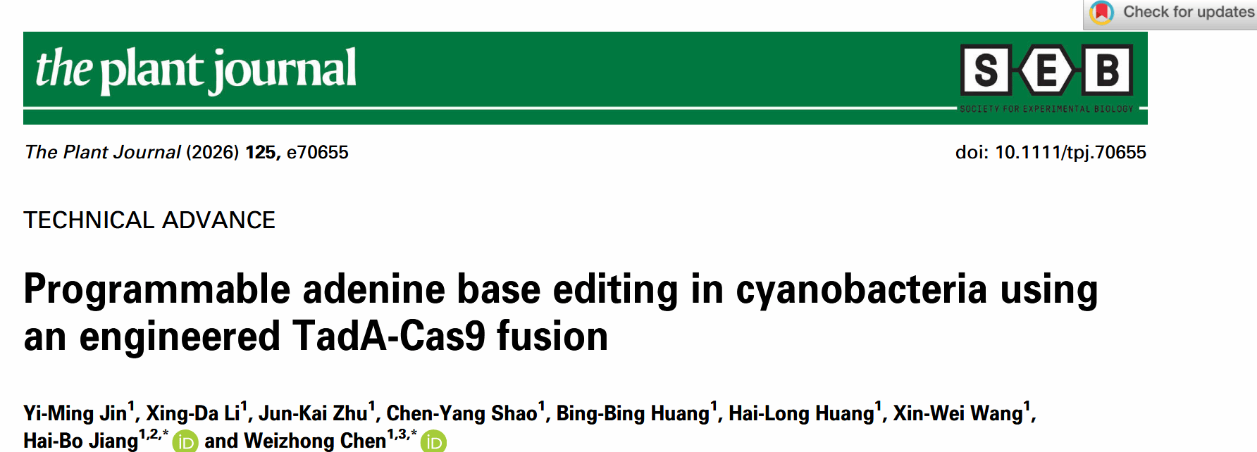 姜海波教授团队成功开发出一种适用于蓝藻的新型腺嘌呤碱基编辑器,实现了蓝藻基因组中特定位点A•T到G•C的高效精准编辑。该成果以“Programmable adenine base editing in cyanobacteria using an engineered TadA-Cas9 fusion”为题,发表于植物学领域知名期刊《The Plant Journal》(图1)。